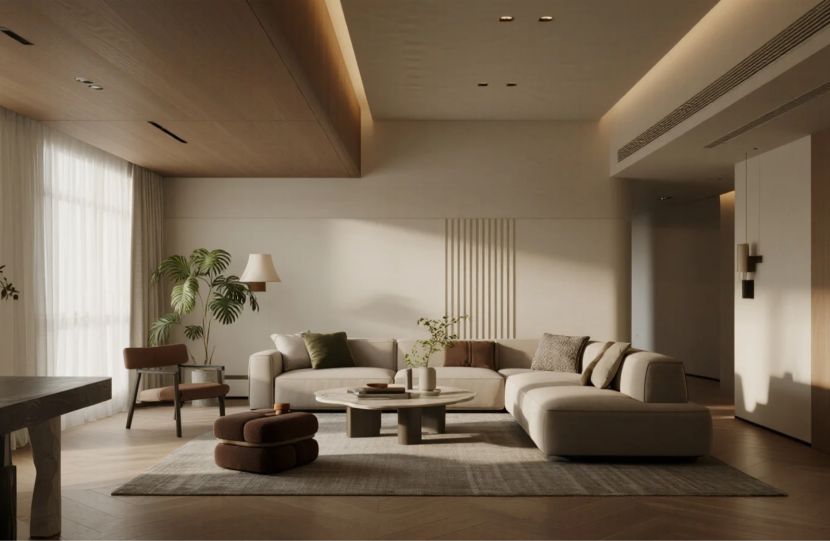 暖白沙发与地毯默契配合,围合松弛的弧形场域